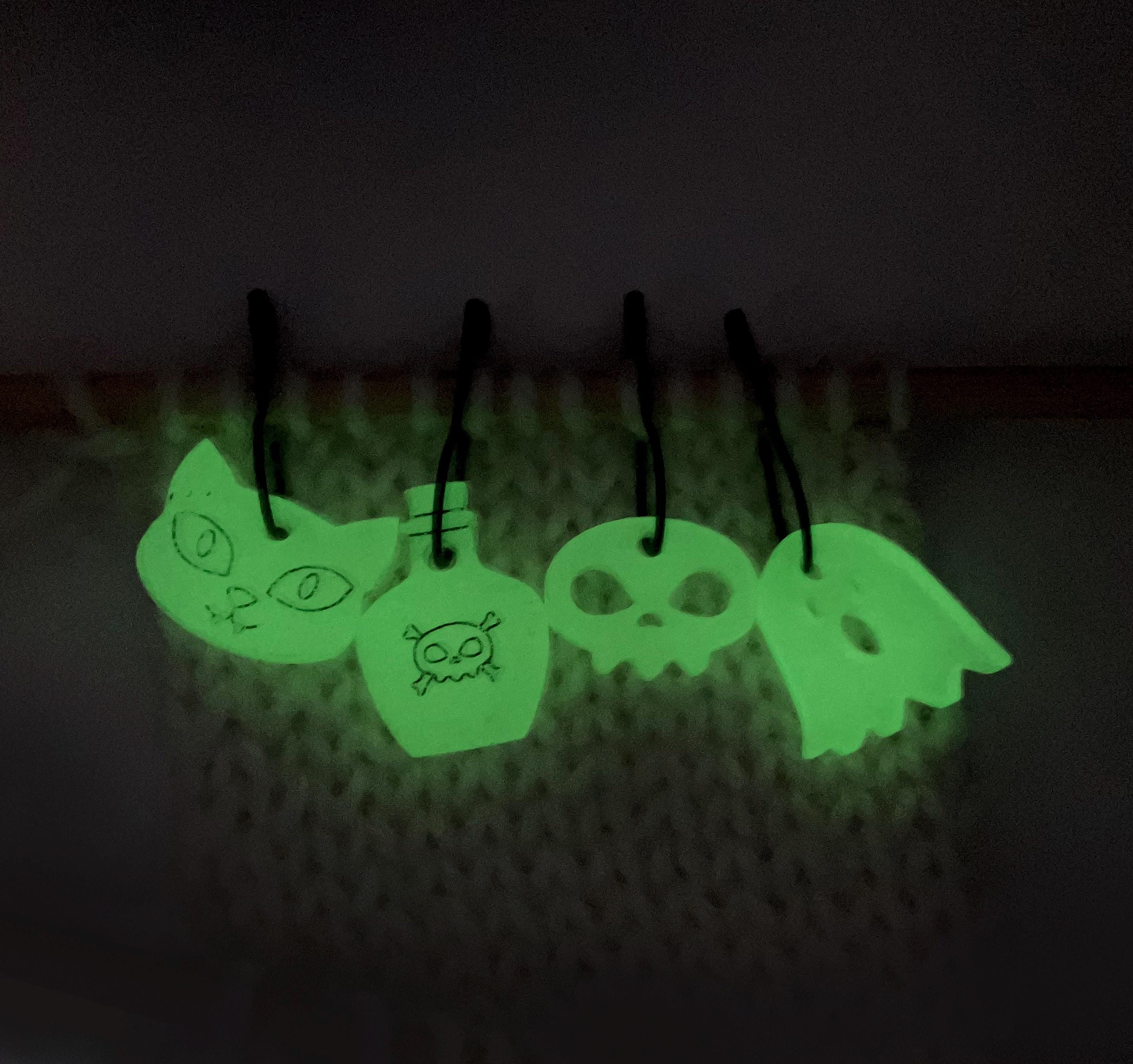 Halloween themed Stitch Markers for knitting and crochet. Set of 4. Colour: Opaque white glow-in-the-dark acrylic, hand coloured in acrylic paint.