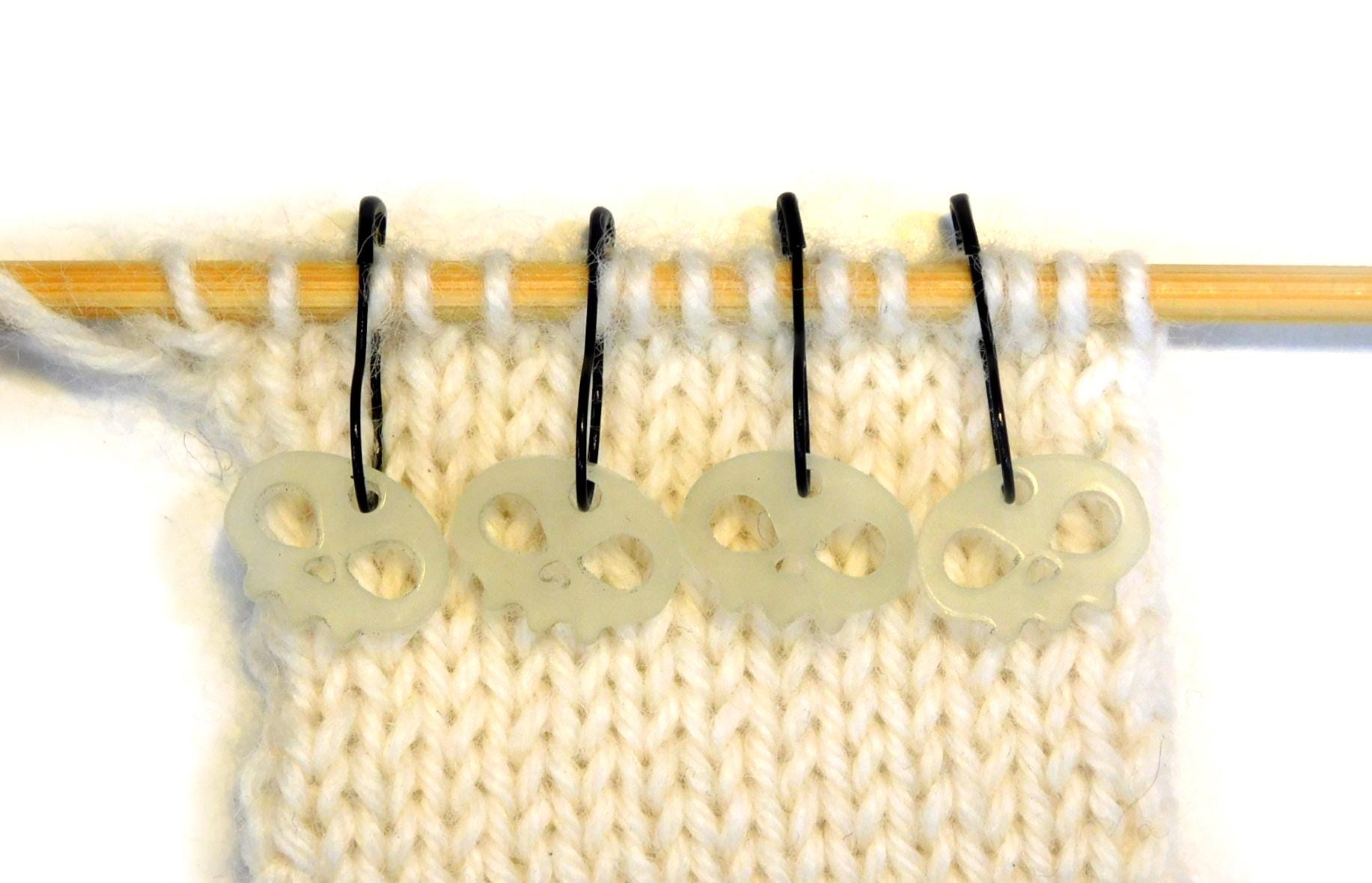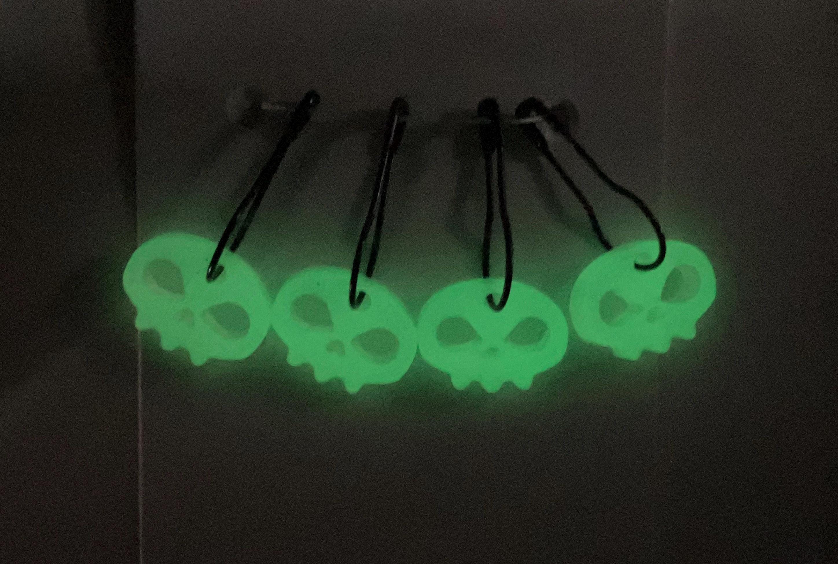 Glow-In-The-Dark Skulls. Halloween themed Stitch Markers for knitting and crochet. Set of 4. Colour: Opaque white glow-in-the-dark acrylic.